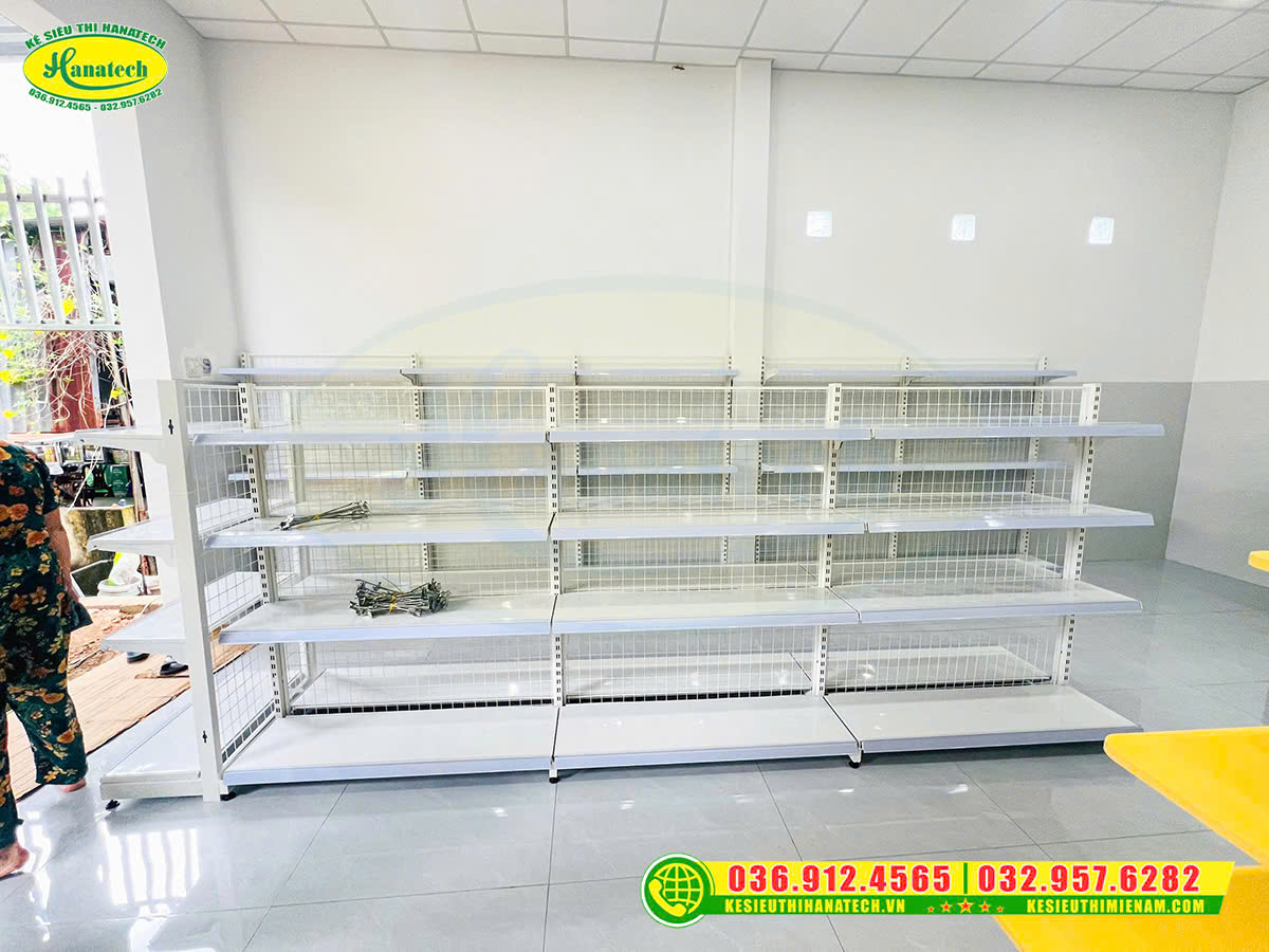 - Kệ siêu thị lưng lưới trắng – đảm bảo thích hợp trưng bày mọi mặt hàng mà còn tiết kiệm ngân sách cho chủ đầu tư.